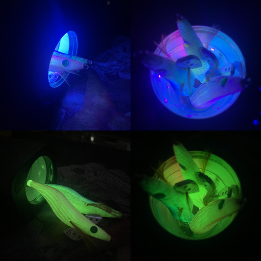 3 x 1.8 Yamashita Squid Jigs + Squidink UV Squid Jigs/Lure Rechargeable Light Box + Squidink Double Rig